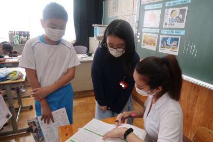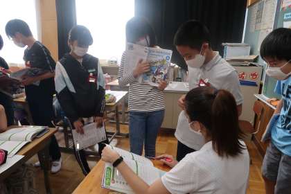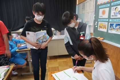 夏休みの出来事を英語で書けた子から順番に並んでいます。