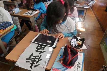 学習用タブレットを使って発表ノートにまとめていました。真剣に取り組んでいました。