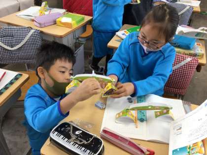 重さの勉強で、天びんを作って重さ調べをしました。1円1枚が1gということも知りました。