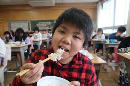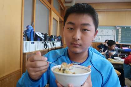本日の給食です。メニューは、麦ご飯、牛乳、中華飯の具、ナムル、大学芋でした。今日も美味しくいただきました。完食できました。
