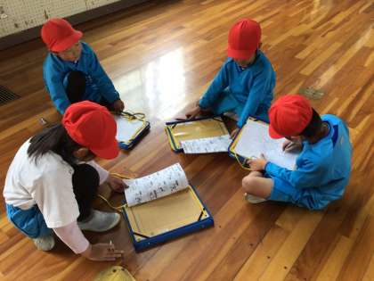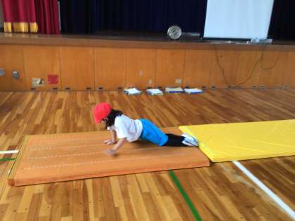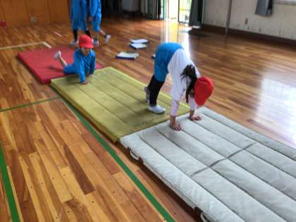 マット運動です。自分で技の練習をしています。技の組み合わせを考えてから、スタートです。
