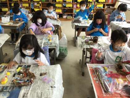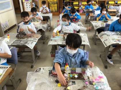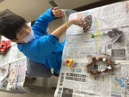 いろいろな材料をつけて、せかいにひとつだけのリースができました。