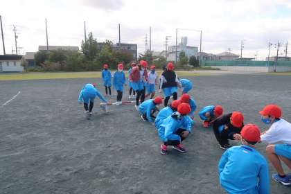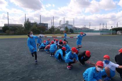 3組の体育の授業です。この日から、スポーツフェスタの練習をしています。台風の目の練習です。元気よくできました。