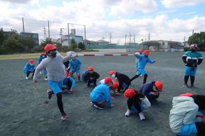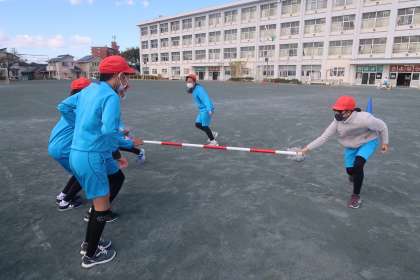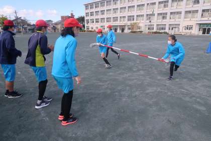 今年の台風の目は、例年よりも少ない3人で棒を持って走ります。また、隣の学級との距離も広くしてあります。
