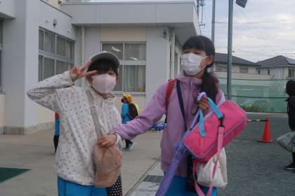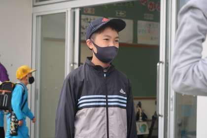 東昇降口前の朝の様子です。挨拶ボランティアをしている子や友達と会話を楽しんでいる子もいます。
