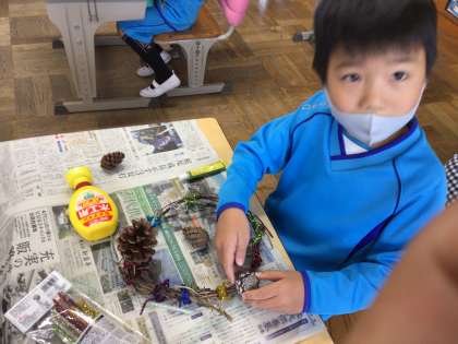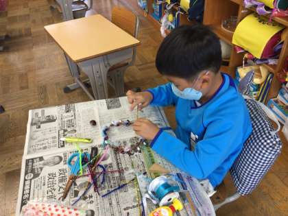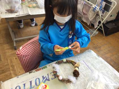 先週作ったリースに飾り付けをしています。