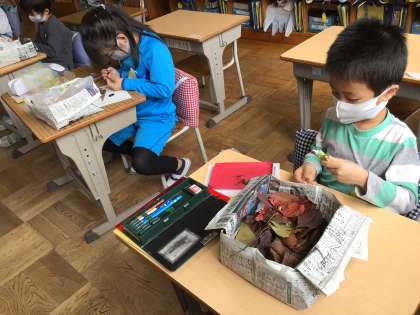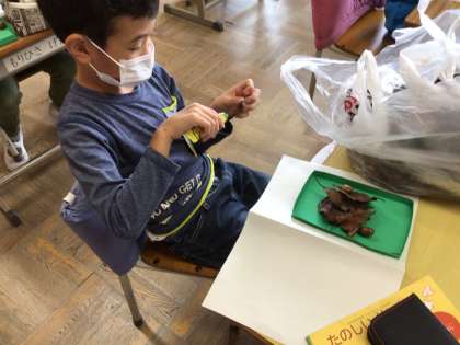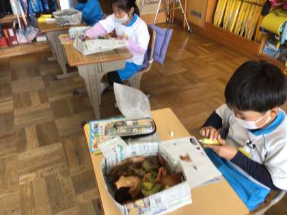 学校の裏庭で、葉っぱを拾ってきました。今日は、何をつくろうかな?