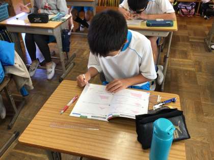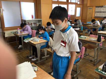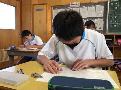 算数の授業です。図形の拡大と縮小の練習問題に取り組んでいました。プリントをやり終えた子は担任の先生のところに行き、採点をしてもらっていました。