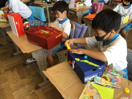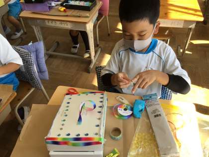 「かざって なにいれよう」の学習です。今日は、完成日!