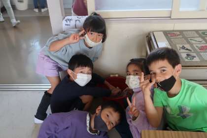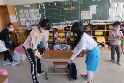 1年4組の教室掃除の様子です。1年生と6年生が仲良く協力して、教室をきれいにしてくれていました。