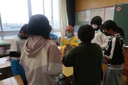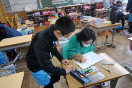休み時間には、カードゲームで盛り上がっていました。また、学級リーダーは、学級をよりよくするための準備をしていました。給食後も元気に過ごしていました。