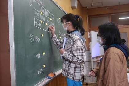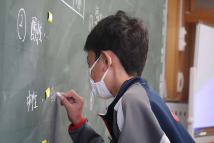 理科の授業です。水溶液の性質のまとめをしていました。酸性、アルカリ性、中性のそれぞれ性質をまとめていました。次時の授業の単元テストに備えて、この単元で習ったことを教科書、ノートを見ながら振り返りをしていました。