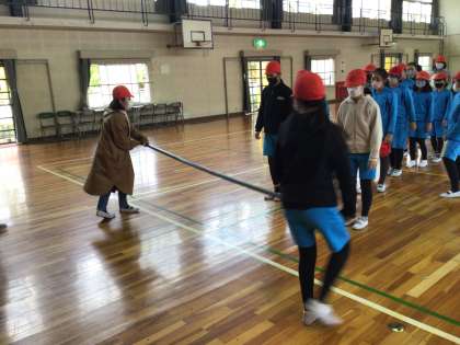 今日の学級活動は、体育館で台風の目の練習をしました。棒を持って足元をくぐらせました。