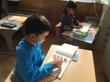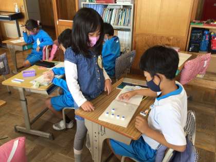 「0のたしざんとひきざん」の学習の様子です。計算ブロックを使って、ゲームをしながら得点のけいさんをしています。