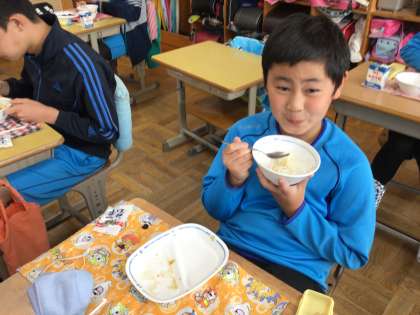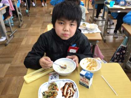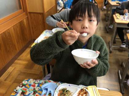 今日の給食の様子です。メニューは、ご飯、牛乳、おでん、肉味噌、おかか和え、乾燥小魚です。今日も美味しくいただいています。
