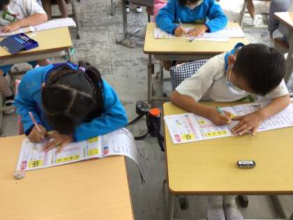 新出漢字の練習をしています。読み方や筆順を習い、姿勢よく書いています。