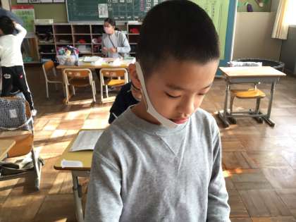朝の片付けの後に明日の連絡を記入していました。