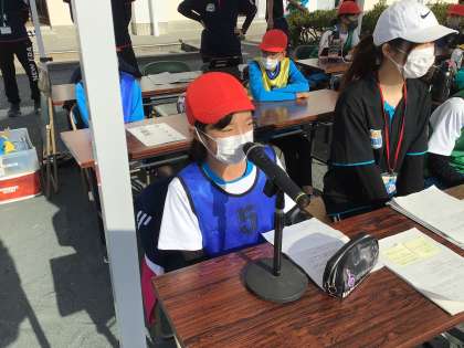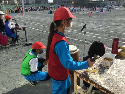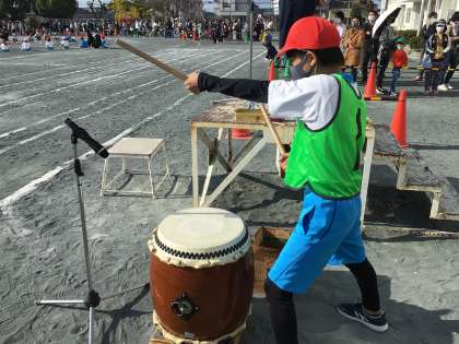 1年生の玉入れです。放送係です。また、籠に入った玉を数える時に、太鼓を叩いています。