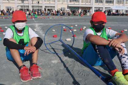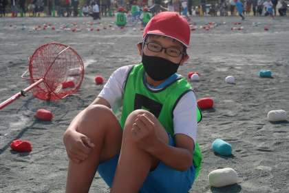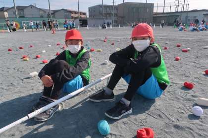 玉入れの競技が始まるまで静かに待っています。