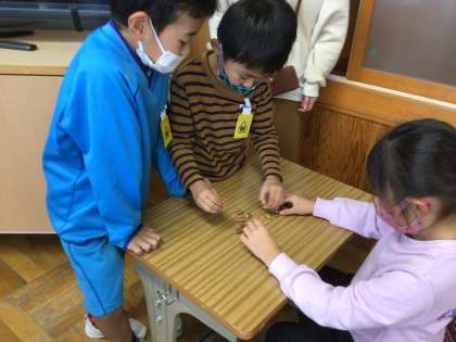 秋の木の実を使った遊びで、みんなたくさん楽しみました。