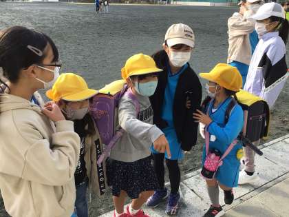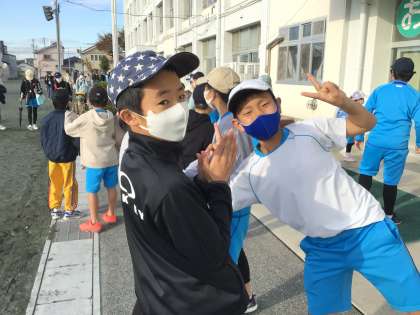1年生と仲良く過ごしています。朝から元気のよい6年生です。