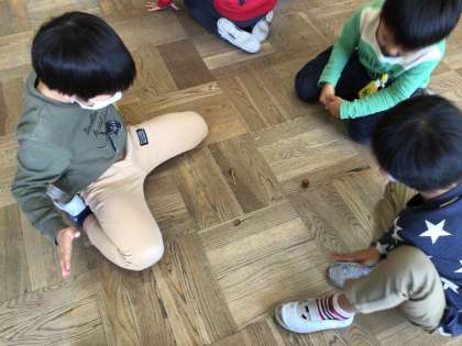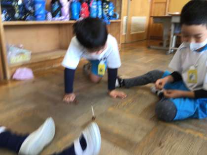 どんぐりごまで、友だちと楽しく競い合いました。