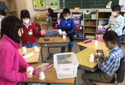 まず、紙コップロケットを作って、どんな遊びができるかを考えました。