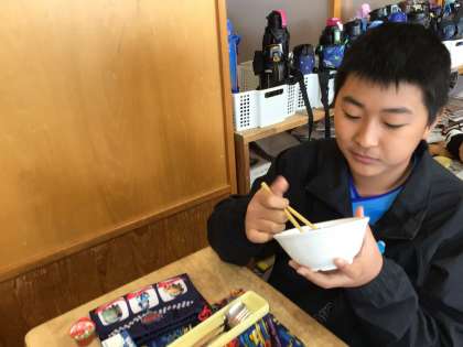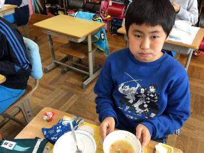 今日の給食の様子です。メニューは、ご飯、牛乳、麦味噌汁、レバーと大豆の甘辛煮、ホウレンソウのおひたし、アセロラゼリーでした。今日も美味しくいただきました。完食出来ました。ごちそうさまでした。