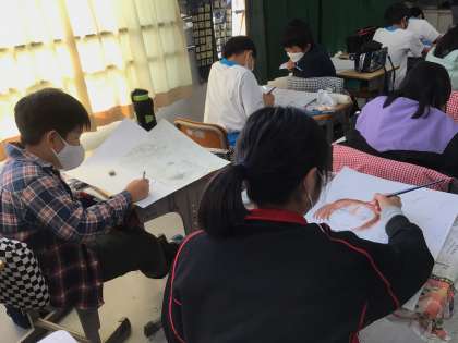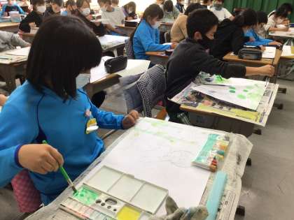 「ウエズレーの国」の読書感想画を描いています。 思い思いに楽しく表現していました。