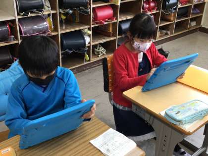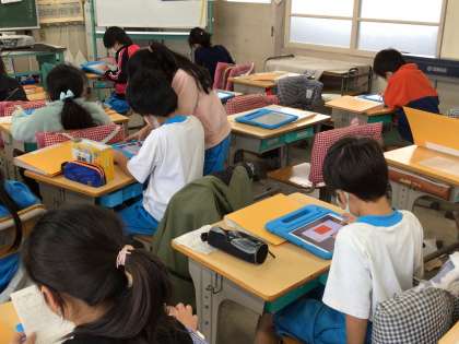 総合的な学習の中で学んできたことをタブレットを使って発表ノートにまとめています。