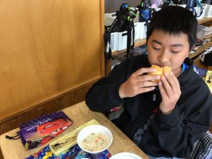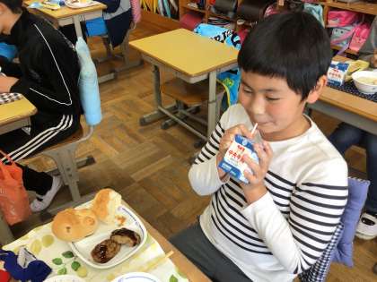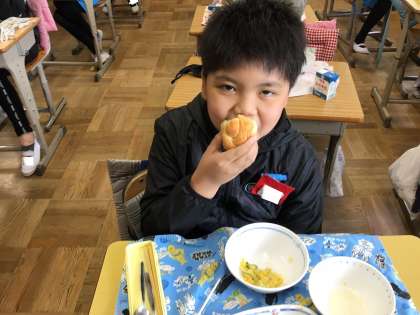 今日の給食の様子です。メニューは、リンゴパン、牛乳、ハンバーグ、きのこのクリーム煮、コーンサラダでした。今日も美味しくいただきました。ごちそうさまでした。