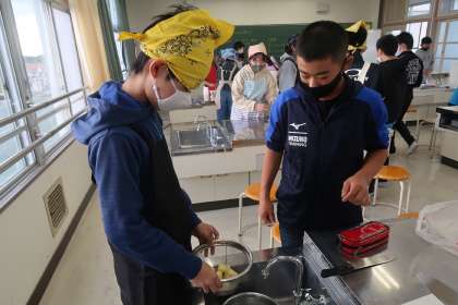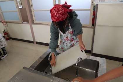 ジャガイモの皮をむき、芽を取った後に、水にさらしていました。使った道具を丁寧に洗って片付けました。