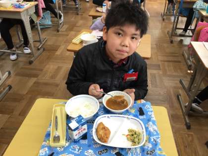 今日の給食は、ご飯、牛乳、サバの竜田揚げ、さつまいもの味噌汁、ごま和えでした。サバの竜田揚げが1番人気がありました。今日も美味しくいただきました。ごちそうさまでした。