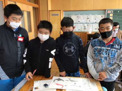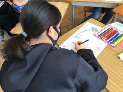 外国語の授業の様子です。グループごとにポスターを作って生態系の仕組みを英語で表現していました。