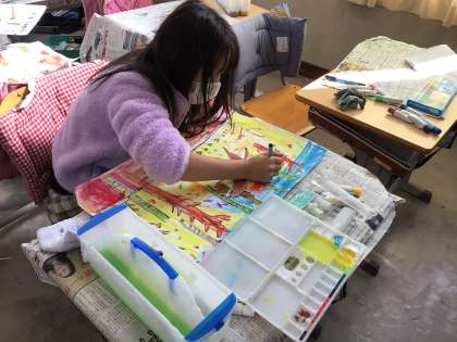 読書感想画の色塗りが続いています。