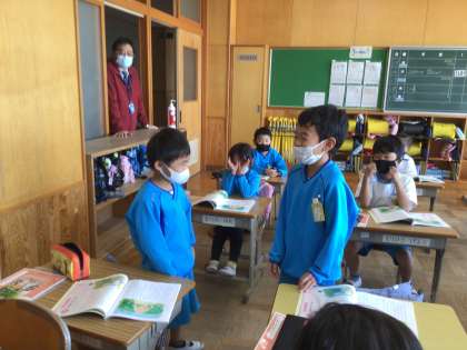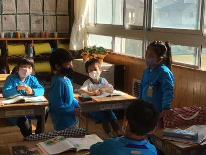 お話を読んで、自分だったらなんて言うかな?と聞くと、友だちと実際にその場面を想定してやってくれました。ちょうど、校長先生が見にきてくださり、張り切ってがんばりました。