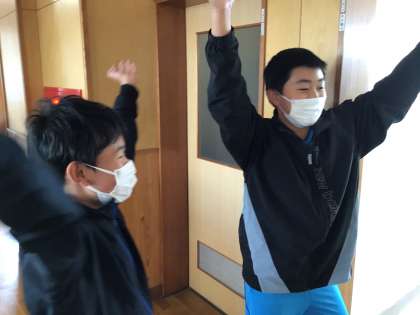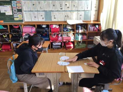 昼放課の様子です。アルファベットの形を体を使って表現していました。また、トランプを楽しんでプレイしていました。