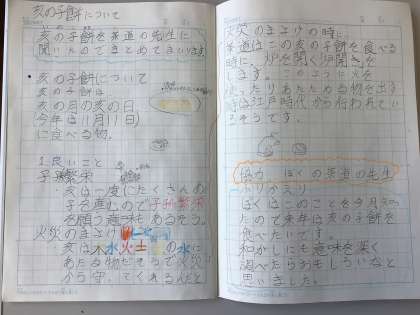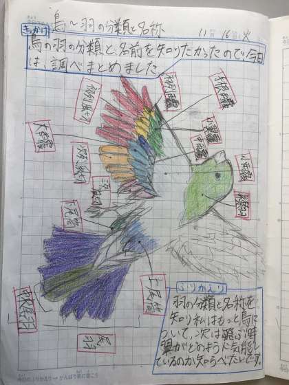 今日の自主学習ノートです。興味をもった鳥の羽について調べています。体育の授業のティボールでバッティング技術力を高める方法を考えています。また、亥の子餅について茶道の先生にインタビューしたことをまとめています。どれも素敵な自主学習ノートです。