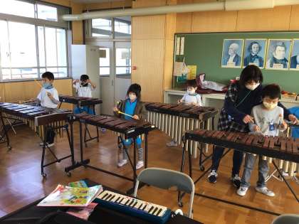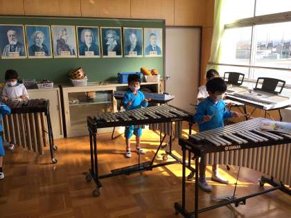 音楽室で鉄琴と木琴を使って「きらきらぼし」を演奏しました。