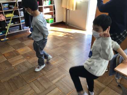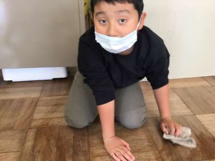 今日の掃除の様子です。床を丁寧に雑巾で拭いていました。明るい雰囲気でした。