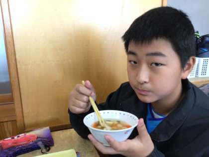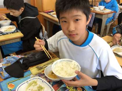 今日の給食の様子です。メニューは、ご飯、牛乳、ふ玉汁、豚肉の生姜炒め、和風サラダでした。今日も美味しくいただきました。