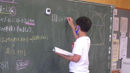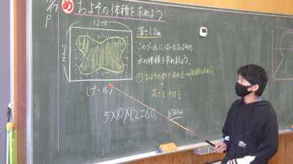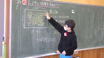 写真は、およその体積の求め方をみんなの前で説明している様子です。