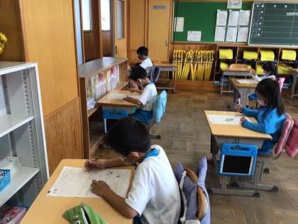 算数、ひきざん(2)の単元テストに取り組んでいます。