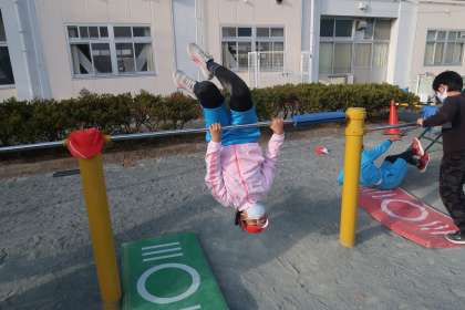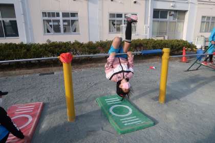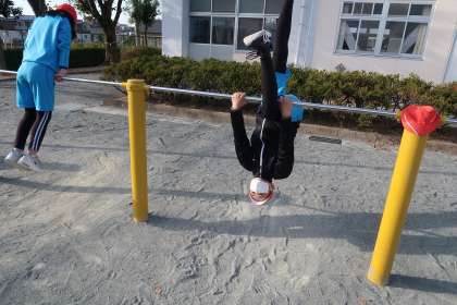 上がる技です。足かけ上がりと逆上がりを披露しています。上手でした。