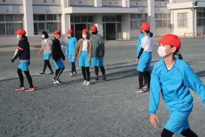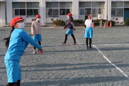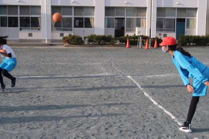 1回目のゲームの終了間際です。外野に残った人数の少ない方が勝ちとなります。