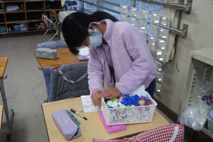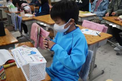 ペットボトルキャップの回収かごに付いている呼びかけのポスターが古くなってきたので、新しい呼びかけのポスターを作っていました。