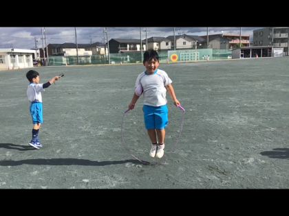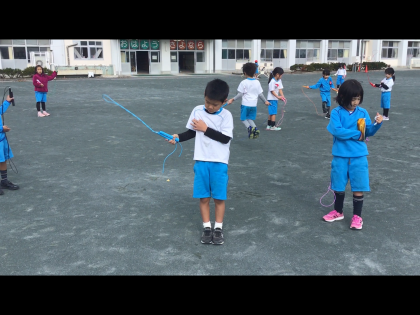 「なわとび遊び」の学習の様子です。より良いフォームで跳ぶことできるように、帽子をわきに挟みながら練習しています。10秒で25回以上前跳びができるようにチャレンジしています。