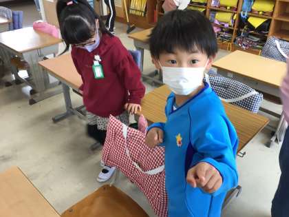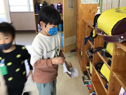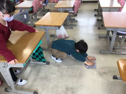 1年生の掃除です。無言でイスを運んだり床を雑巾で拭いていました。頑張っていました。