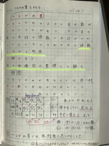 自分が興味をもったことを調べています。また、最後に振り返りも書いてあります。音楽が体に与える影響や、先日の月食、算数のつるかめ算についてまとめてあります。