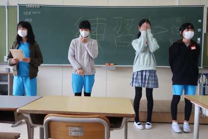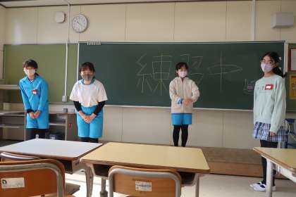 休み時間に、最後の出発式・帰着式の練習を行いました。堂々と進行を進めている姿は立派でした。